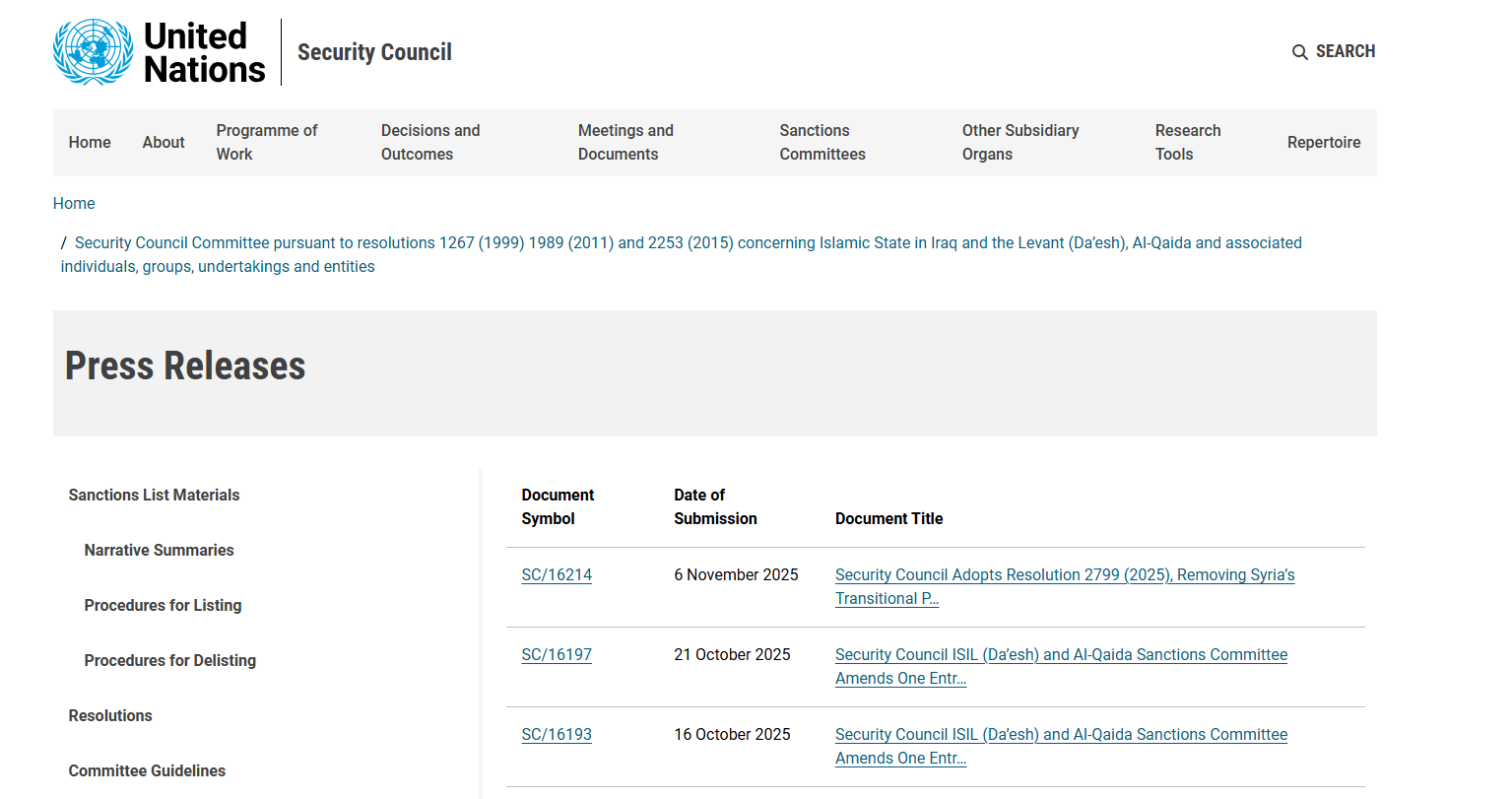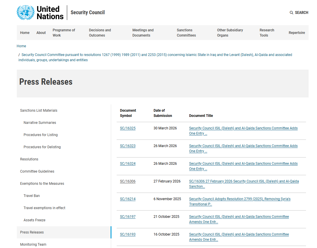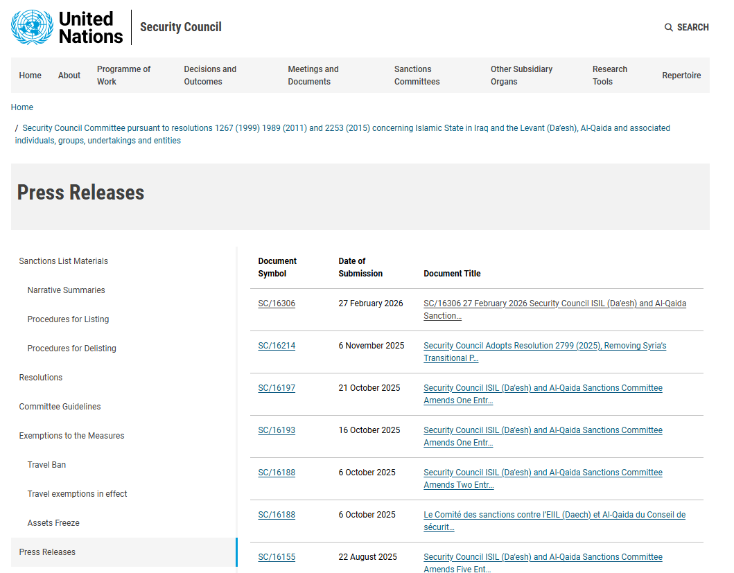 UNSCR Sanction List:main.un.org/securitycouncil/en/sanctions/1267/press-releases