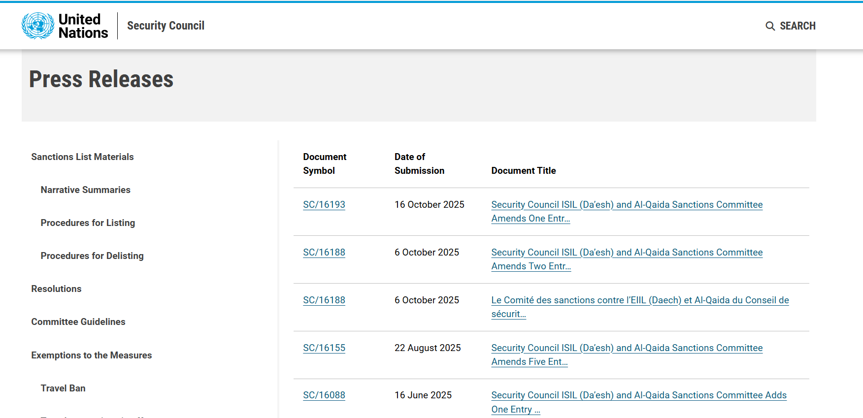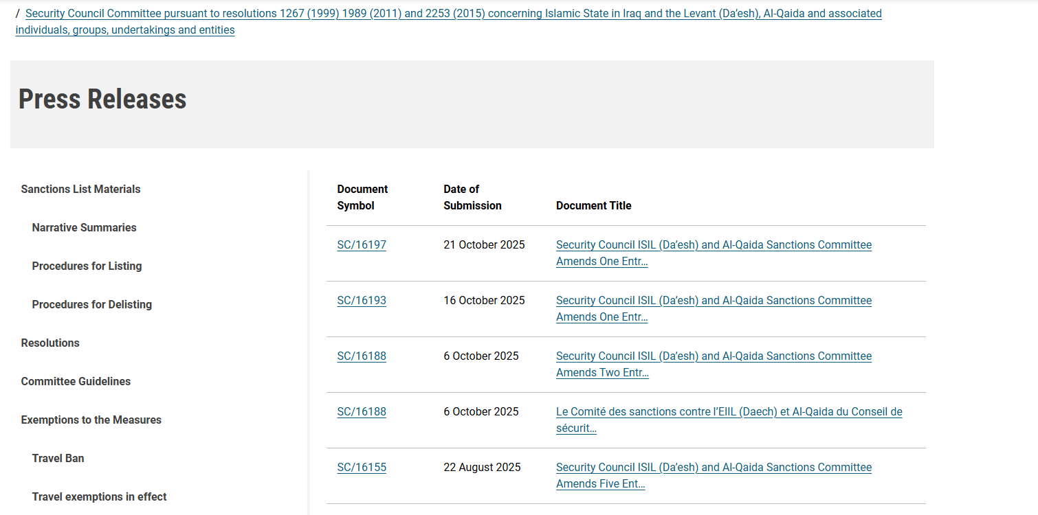UNSCR Sanction List:main.un.org/securitycouncil/en/sanctions/1267/press-releases